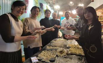 最后,进入迎新年包饺子环节。大家分工合作、各显神通,有调陷的、有和面的、有擀面皮的,场面热火朝天。不一会功夫,大家就包出了几百个形状各异、荤素不同的饺子。一盘盘饺子送进沸水的大锅,饺子起锅、香味四溢,大家一边吃着味美可口的饺子一边聊着天,气氛异常欢快活跃。